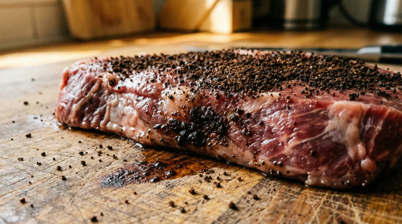 Vor dem Braten kratzt du die grobe Paste mit dem Messerrücken leicht ab. Du musst das Steak nicht abwaschen. Ein feiner Film darf ruhig auf dem Fleisch verbleiben. Dieser Rest sorgt beim Anbraten in der heißen Pfanne für eine fantastische, dunkle und aromatische Kruste.