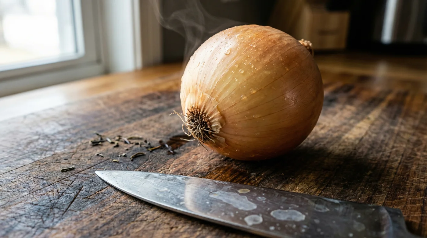 Nimm die Zwiebel danach heraus. Sie sollte sich äußerlich kaum warm anfühlen, höchstens lauwarm an den Schnittstellen. Lass sie für eine gute Minute auf dem Schneidebrett ruhen, damit sich die Temperatur im Inneren stabilisiert. Danach entfernst du die raschelnde Schale wie gewohnt. Du wirst beim ersten Schnitt spüren, dass das Fleisch fest und widerstandsfähig geblieben ist, aber die gefürchtete beißende Wolke einfach ausbleibt. Das Messer gleitet mit einem satten Geräusch durch die Schichten, und deine Augen bleiben klar.