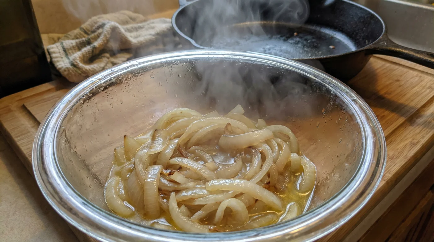 Hier greift ein völlig anderer Ansatz: Entziehe der Zwiebel ihr Schutzschild, bevor sie das heiße Fett auch nur berührt. Wenn du die feinen Ringe für zwei Minuten in die Mikrowelle gibst, bringst du das Zellwasser im Inneren zum Kochen. Die Zellwände brechen auf, das Wasser tritt aus und sammelt sich am Boden der Schale. Du überspringst die fehleranfälligste Phase des gesamten Kochvorgangs komplett.